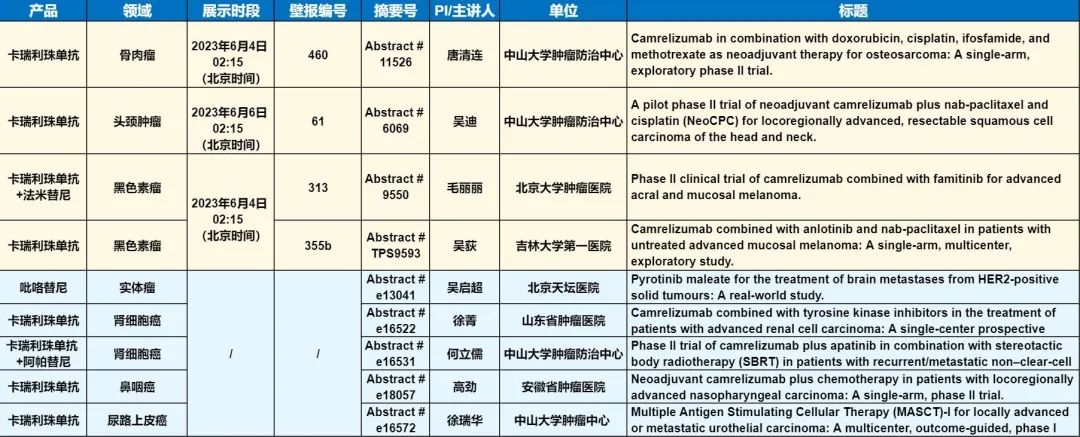 此外,在头颈肿瘤、黑色素瘤、骨肉瘤、鼻咽癌、肾细胞癌、尿路上皮癌等多个领域,卡瑞利珠单抗、吡咯替尼等产品相关研究一共入选了4项壁报展示和5项线上发表,彰显了AG尊龙凯时医药强大的自主研发综合实力。