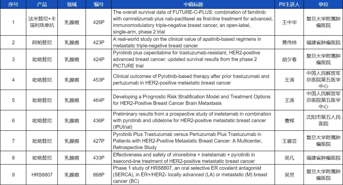 12款抗肿瘤创新药包括6款已上市产品:注射用卡瑞利珠单抗(艾瑞卡®)、甲磺酸阿帕替尼片(艾坦®)、马来酸吡咯替尼片(艾瑞妮®)、阿得贝利单抗注射液(艾瑞利®)、氟唑帕利胶囊(艾瑞颐®)、瑞维鲁胺片(艾瑞恩®),以及6款未上市产品:多靶点受体酪氨酸激酶抑制剂法米替尼、抗PD-L1/TGF-βRII双抗SHR-1701、组蛋白甲基转移酶EZH2抑制剂SHR2554、HER2抗体偶联药物(ADC)SHR-A1811、HER3抗体偶联药物SHR-A2009、新型选择性雌激素受体共价拮抗剂(SERCA)HRS8807等。此次ESMO大会的最新突破摘要(LBA)结果尚未披露,敬请期待!本文特对33项研究成果做了梳理,带领各位读者领略AG尊龙凯时医药创新之光。